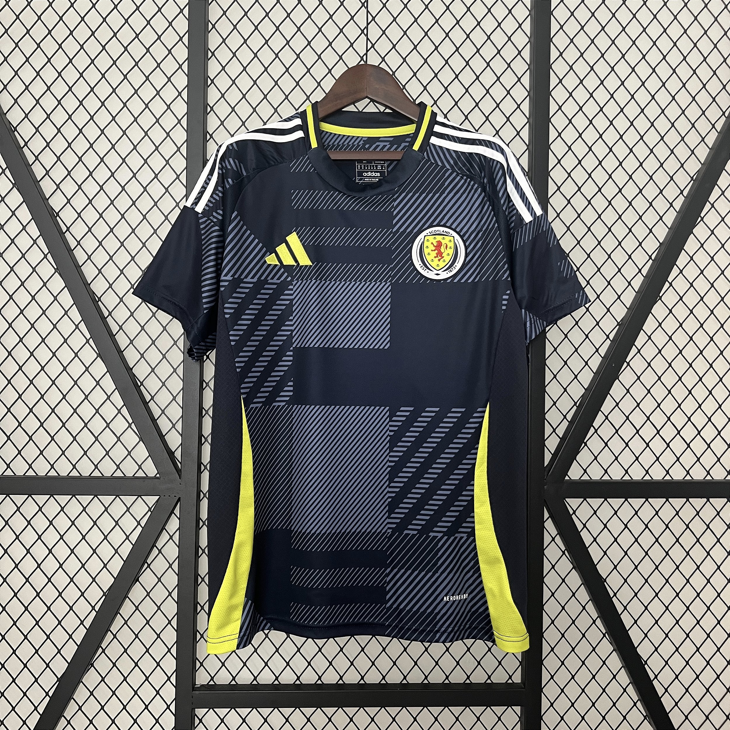 Com um design sofisticado em azul-marinho, o modelo se destaca pelos grafismos inspirados no tradicional tartã escocês, trazendo um visual autêntico e cheio de identidade cultural. Os detalhes em amarelo vibrante adicionam contraste e modernidade, enquanto o acabamento desenvolvido pela adidas garante durabilidade e um visual impecável por muito mais tempo.